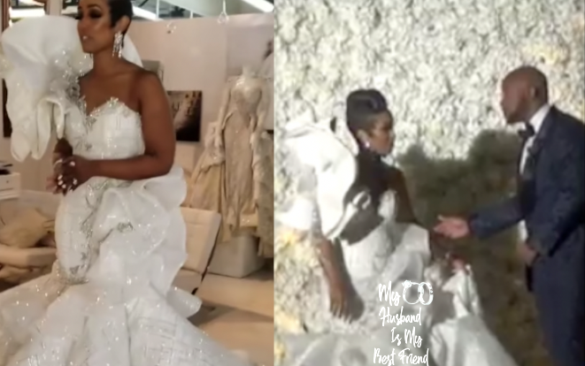 Nicole Pantenburg Wedding : Official wedding portrait, and wife nicole, 41, looks stunning in a beaded white gown, flowing tulle veil.